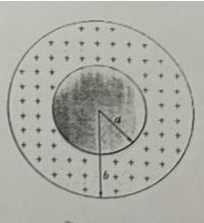 Figure shows a spherical shell with uniform volume charge density p= 1.84 nC/m3. Inner radius a= 10.0 cm and outer radius b= 2.00a. What is the magnetic of the electric field at a radical distances (a) r=0; (b) r=a/2.00; (c) r=a; (d) r= 1.50a; (e) r= b; and (f) r= 3.00b?